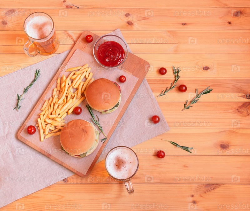 Кружки пива, гамбургеры, жареный картофель, розмарин и помидоры черри на деревянном столе