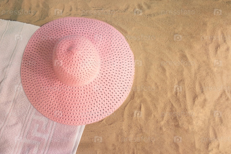 Большая летняя шляпа и полотенце на песчаном пляже. Вид сверху, пространство для копирования