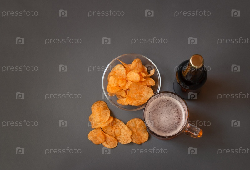 Кружка пива, бутылка пива и картофельные чипсы на сером фоне. Выборочный фокус. Вид сверху с копией пространства