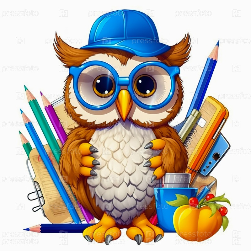 Иллюстрация совы со школьными принадлежностями. Концепция школьного образования. Генеративный ИИ