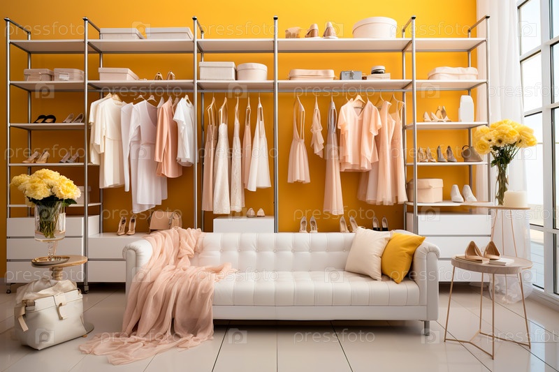 Стильная большая современная гардеробная в желтых тонах. Генеративный ИИ