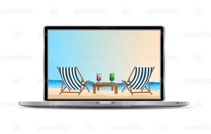 Ноутбук с изображением морского побережья, пляжа. Концепция онлайн-бронирования, заказ онлайн-туров на летние пляжи в курортный сезон, реклама сайтов, летние выходные, электронная коммерция, продажа