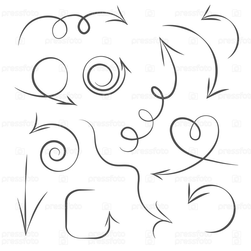 Инфографические элементы на изолированном белом фоне, простые стрелки. Линейный художественный стиль. Набор различных указателей и стрелок. Черно-белая иллюстрация. Дудлы
