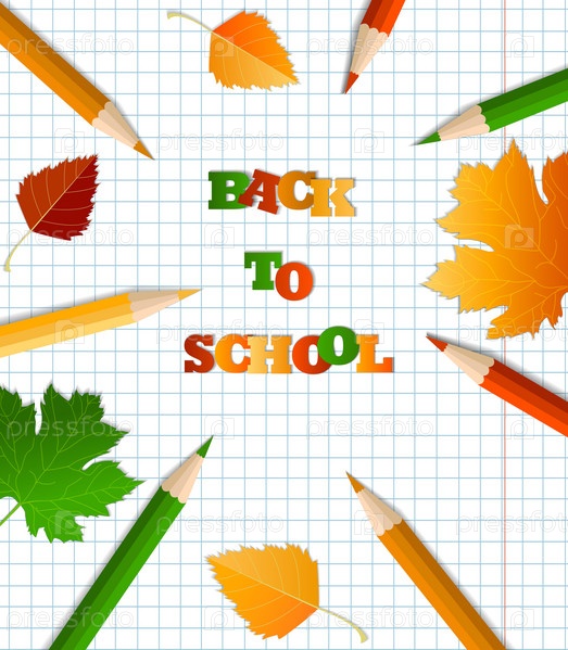 Цветные карандаши с ластиком, школьные принадлежности, канцтовары, тетрадь в клетку. Концепция обучения, снова в школу, впервые в школу. осень, осенние листья