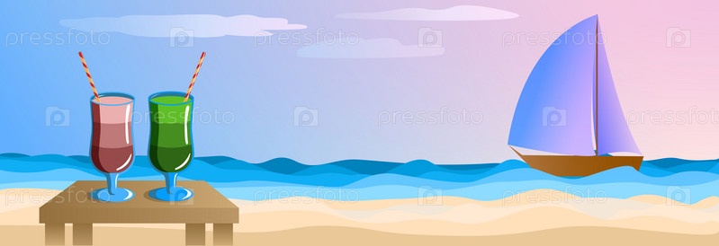 Широкий баннер. Летний вечерний морской фон, розовый свет заката, яхта в море и два пляжных коктейля на песке. Открытка, реклама курортного сезона, пляжный отдых
