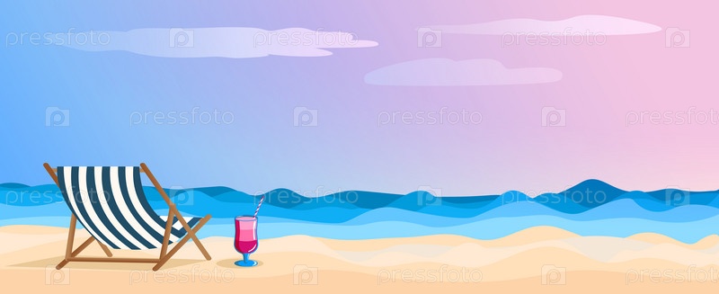 Широкий баннер. Летний вечерний морской фон, розовый свет заката, яхта в море и пляжный коктейль на песке. Открытка, реклама курортного сезона, пляжный отдых