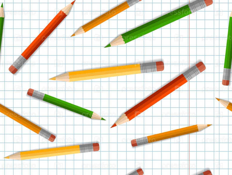 Цветные карандаши с ластиком, школьные принадлежности, канцтовары, тетрадь в клетку. Концепция обучения, снова в школу, впервые в школу. Бесшовный узор