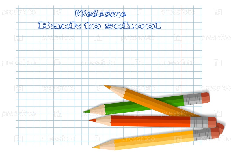 Простой карандаш с ластиком, школьные принадлежности, канцелярские принадлежности, тетрадь в клетку. Концепция обучения, снова в школу, впервые в школу