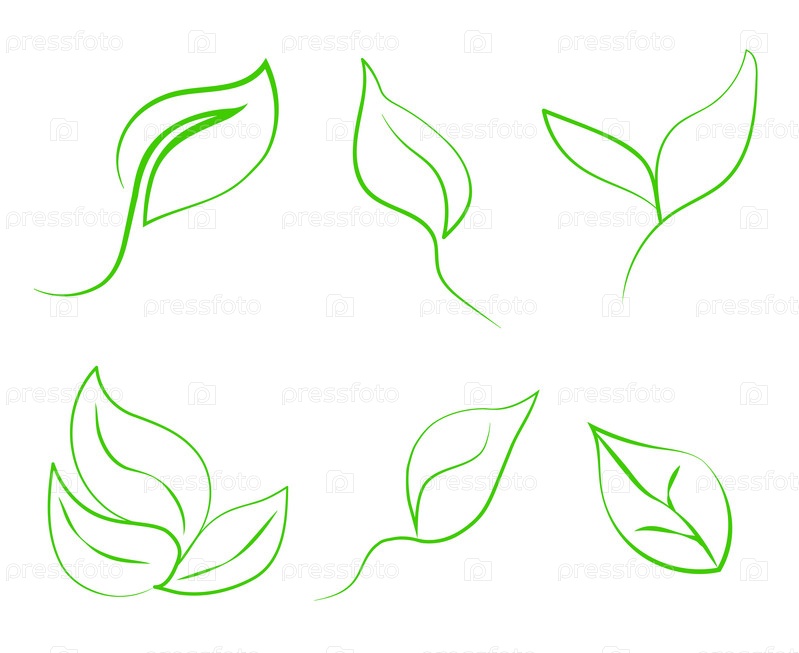 Набор зеленых листьев, символизирующих эко, зеленую энергию, экологию. Векторное изображение, эскиз в стиле линейного искусства