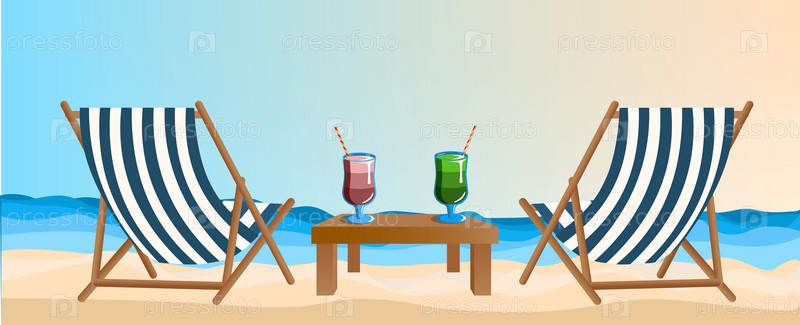 Широкий баннер. Морское побережье, два шезлонга, коктейли на пляже, солнце, море и песок. Летний отдых в жарких странах, пляжный отдых. Баннер для рекламы туров, путешествий, отдыха
