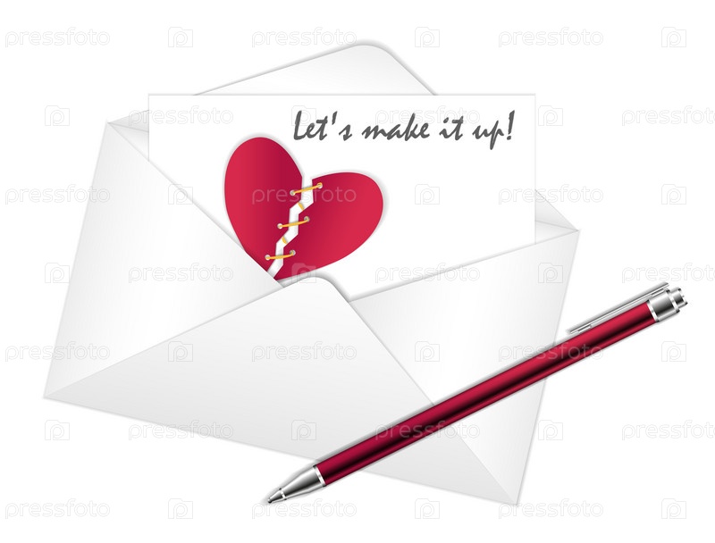 Красное разбитое сердце в конверте с письмом. Надпись Давайте помиримся. Концепция примирения, поддержки семьи, заботы. Концепция дружбы и доверия