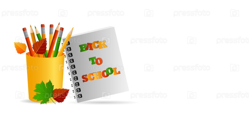 Широкий баннер, концепция возвращения в школу, день знаний, 1 сентября, школьные принадлежности в кармане, разноцветные яркие канцтовары. На белом фоне с тенью и копировальным пространством