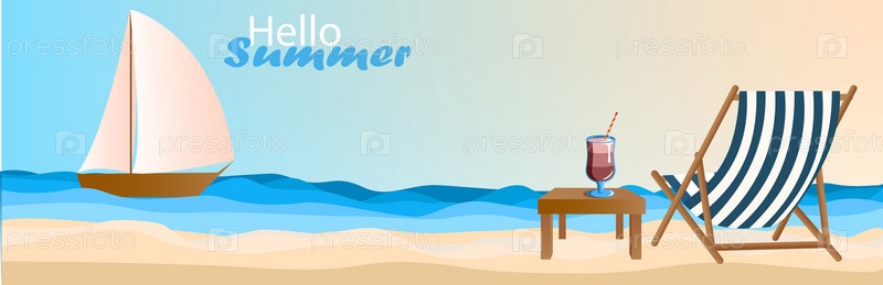 Широкий баннер. Морское побережье, два шезлонга, коктейли на пляже, солнце, море и песок. Летний отдых в жарких странах, пляжный отдых. Баннер для рекламы туров, путешествий, отдыха