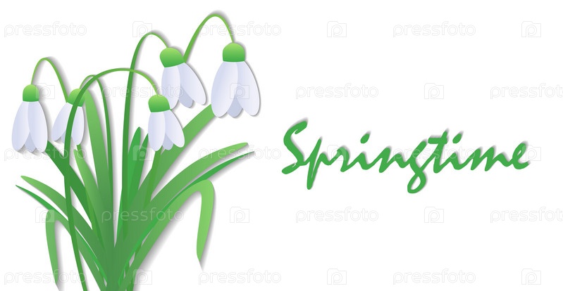Снежинки или Galanthus nivalis на белом фоне. весенняя векторная иллюстрация в виде баннера с красивой надписью. векторный фон с цветом. открытка, приглашение, реклама