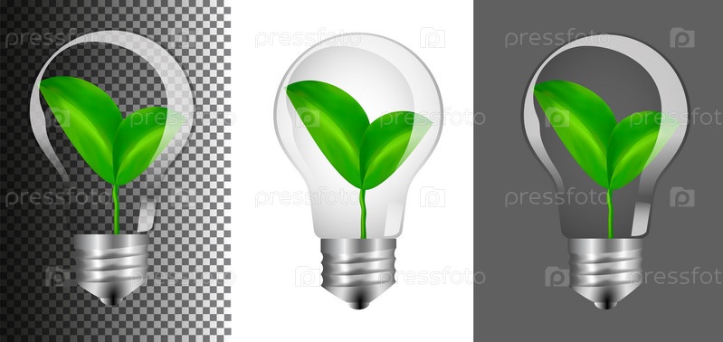 Реалистичная стеклянная прозрачная электрическая лампочка с металлическим патроном e27, зелёным растением внутри. Концепция зеленой чистой энергии и концепция Дня Земли, любовь к природе и вашему дому. Вектор