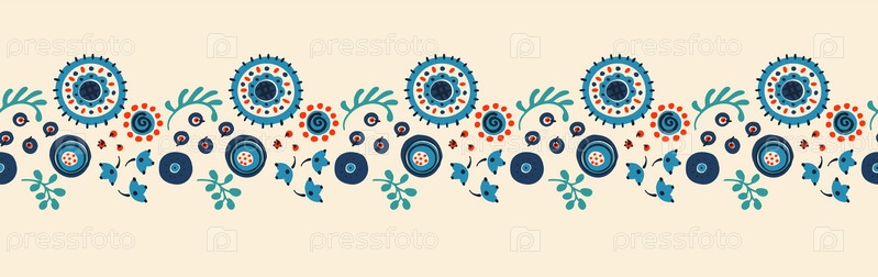 Набор этнических элементов. Бордюр представляет собой полосу с цветами, листьями, ветками, вензелями. Народная вышивка. Славянский, украинский, русский мотив. Хохлома, матрешка, дымковская игрушка. Мексиканский, индийский, цыганский ковер. Вязаное кружево