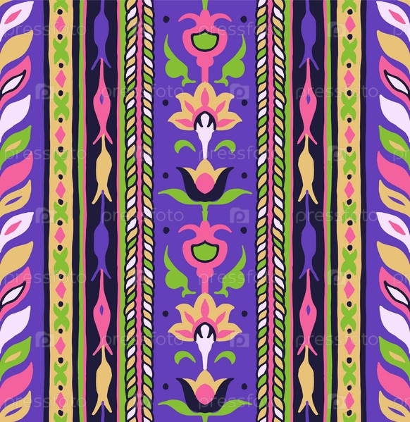 Геометрический дамасский орнамент. Икат границы. Этническая вышивка с листьями и монограммами. Племенная векторная текстура. Бесшовный народный узор в ацтекском стиле. Индийский, скандинавский, цыганский, мексиканский, африканский ковер