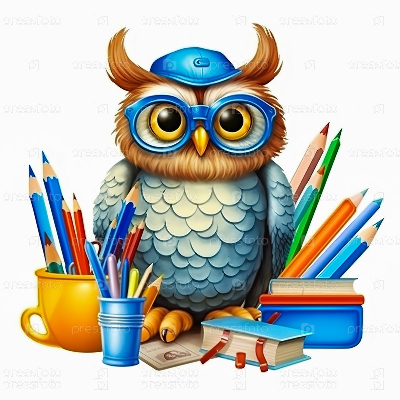 Иллюстрация совы со школьными принадлежностями. Концепция школьного образования. Генеративный ИИ