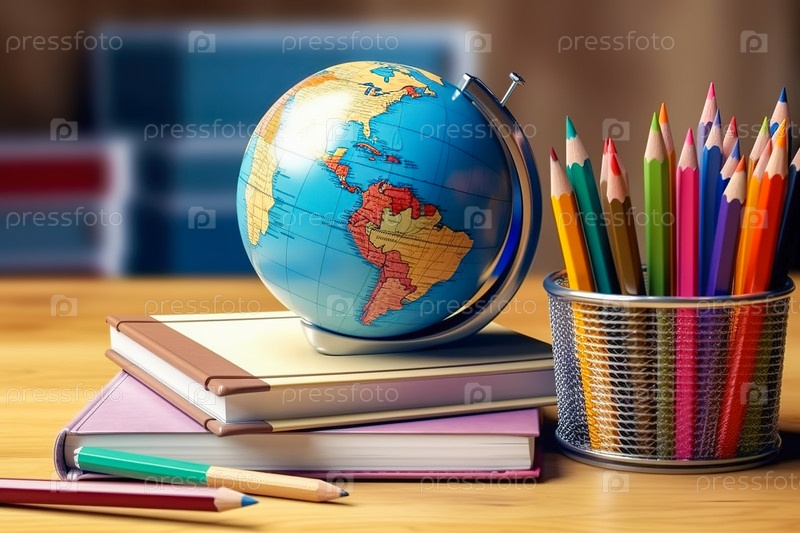 Глобус и школьные принадлежности на столе. Концепция школьного образования. Генеративный ИИ