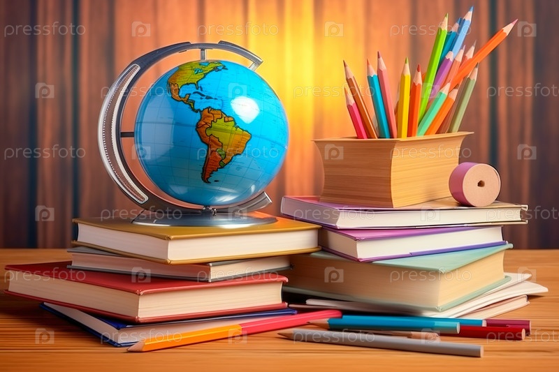 Глобус и школьные принадлежности на столе. Концепция школьного образования. Генеративный ИИ