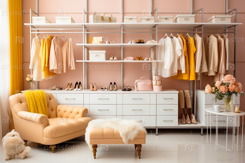 Стильная большая, современная гардеробная в бежевых тонах. Генеративный ИИ