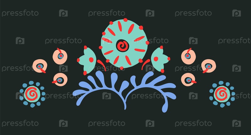 Набор этнических элементов. Бордюр представляет собой полосу с цветами, листьями, ветками, вензелями. Народная вышивка. Славянский, украинский, русский мотив. Хохлома, матрешка, дымковская игрушка. Мексиканский, индийский, цыганский ковер. Вязаное кружево