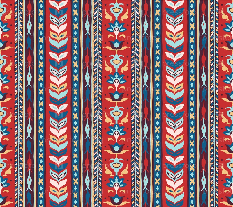 Геометрический дамасский орнамент. Икат границы. Этническая вышивка с листьями и монограммами. Племенная векторная текстура. Бесшовный народный узор в ацтекском стиле. Индийский, скандинавский, цыганский, мексиканский, африканский ковер