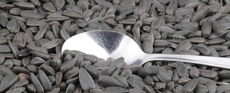 Фон семечки подсолнуха и одна чайная ложка