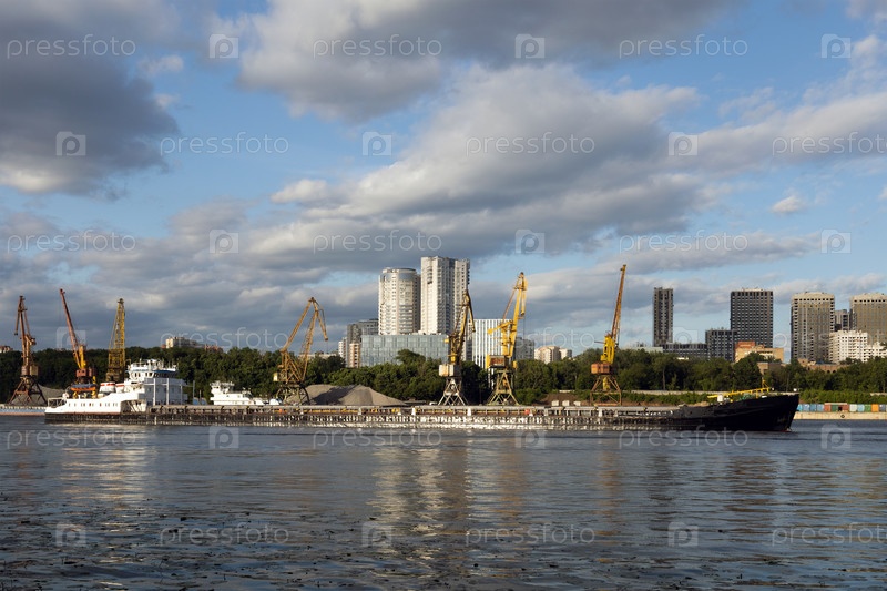 Баржа идет по Химкинскому водохранилищу. Москва