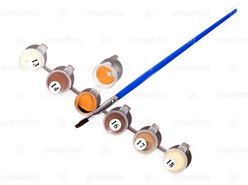 Кисть лежит рядом с контейнерами для акриловых красок. Рисование по номерам. Сфотографировано сверху на белом фоне. Изолировать