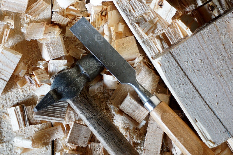 Молоток и долото лежат на досках среди щепок. Столярные инструменты за работой. Фрагменты столярных инструментов. Вид сверху