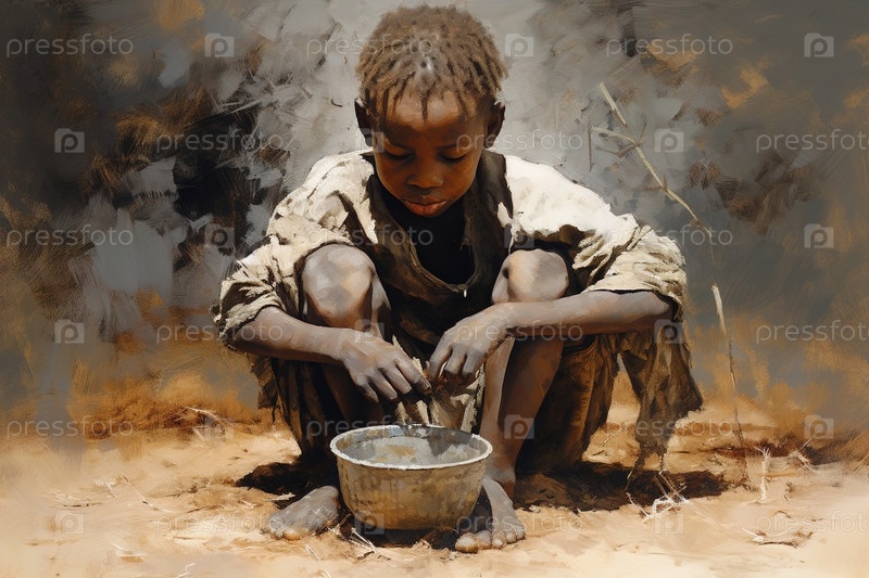 Африканский голодный мальчик сидит на земле и ест. Генеративный ИИ