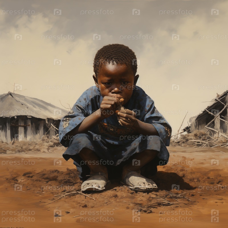Африканский голодный мальчик сидит на земле и ест. Генеративный ИИ. Иллюстрация высокого качества