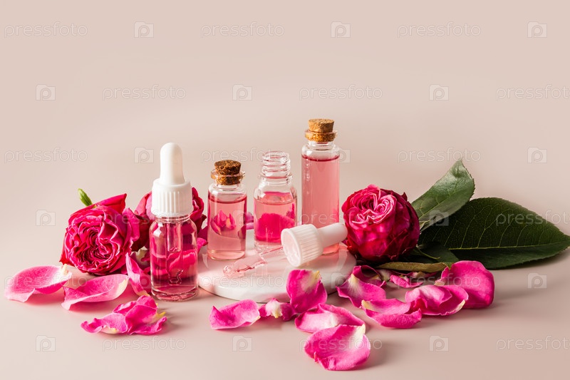Набор косметики на основе розового масла в различных флаконах среди бутонов маленьких роз на бежевом фоне. домашний уход