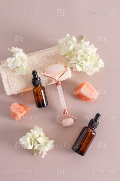 Набор косметики во флаконах с пипеткой, валиком и солями для ванн на пастельном фоне. Концепция заботы о себе. спа. Вертикальный вид сверху