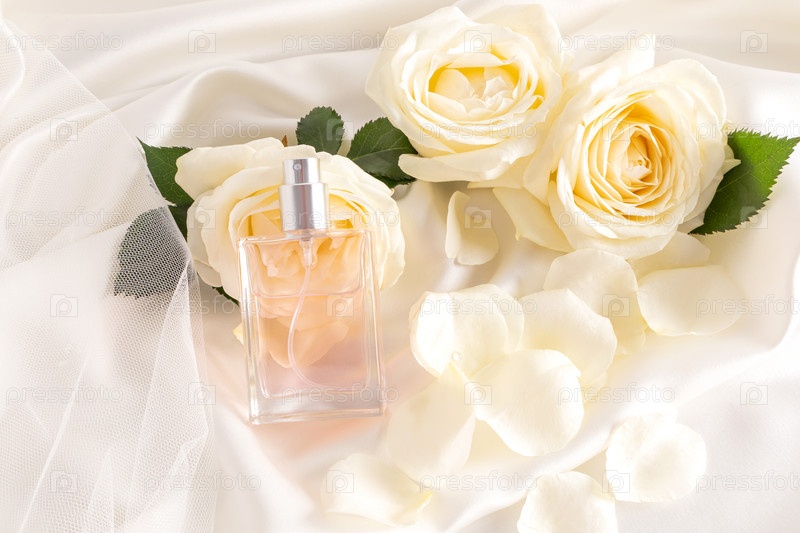 Элегантный флакон косметического средства или спрея опирался на цветок нежной чайной розы. атласный кремовый фон. Пустой макет для брендинга