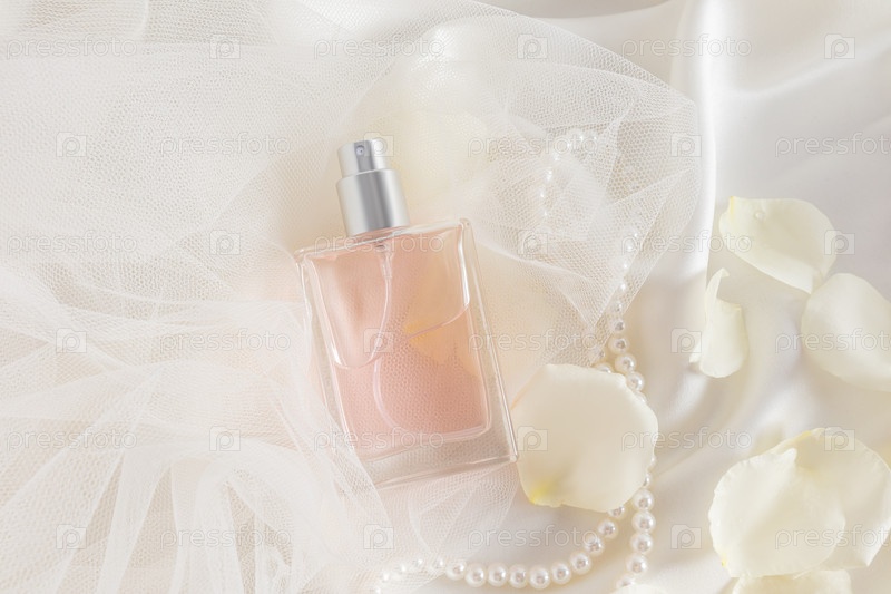 Шикарный флакон женских духов или парфюмированной воды с нежным запахом розы лежит на атласной ткани цвета сливок и лепестков роз