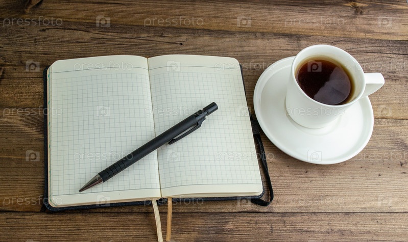 Кофе в чашке, блокнот и ручка на столе