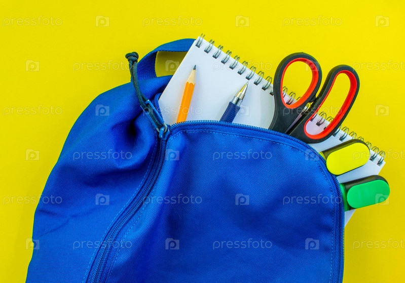 Школьный рюкзак, карандаш, ручка, маркеры, ножницы и блокнот на желтом фоне