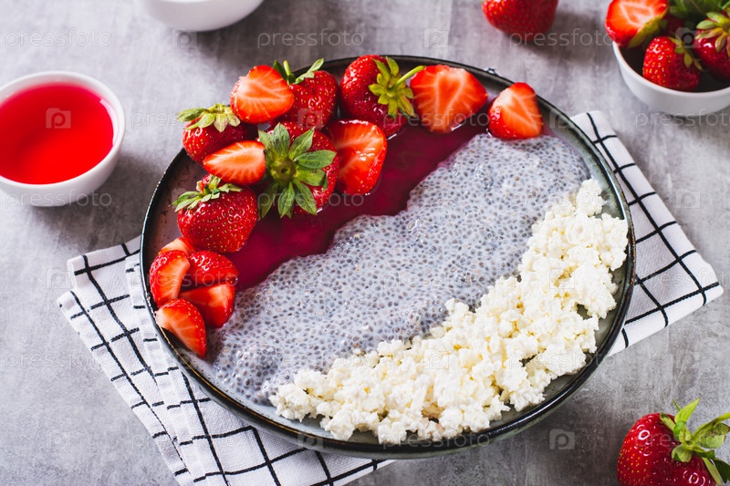Пудинг чиа, творог, мармелад и свежая клубника на тарелке