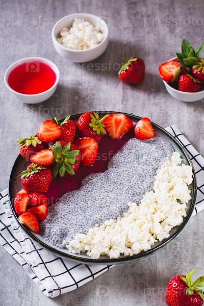 Пудинг чиа, творог, мармелад и свежая клубника на тарелке по вертикали