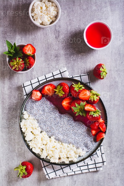 Пудинг чиа, творог, мармелад и свежая клубника на тарелке и вертикальный вид