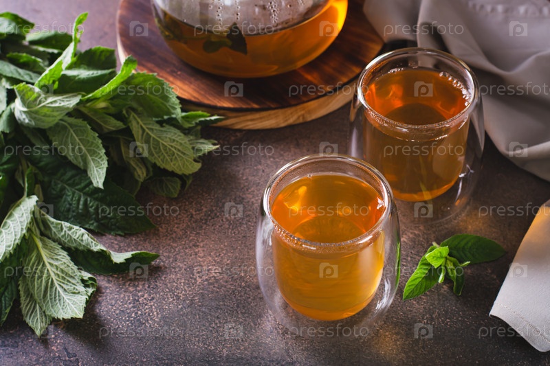 Успокаивающий зеленый мятный чай в чашках и чайник на столе