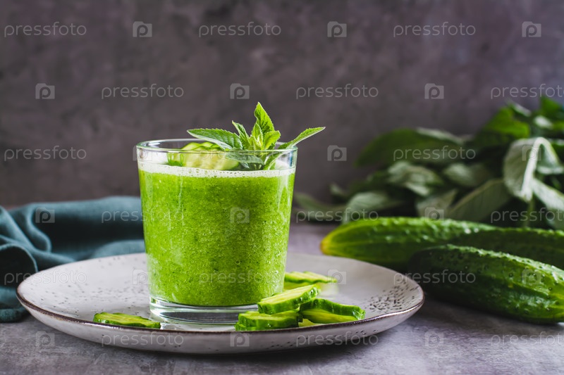 Освежающий смузи из огурца и мяты в стакане на столе