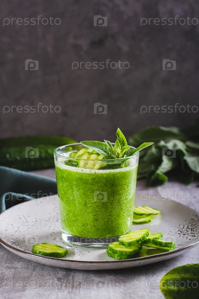 Освежающий смузи из огурца и мяты в стакане на столе, вертикальный вид