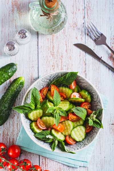 Диетический салат из огурцов, помидоров и мяты в миске на столешнице и вертикальный вид