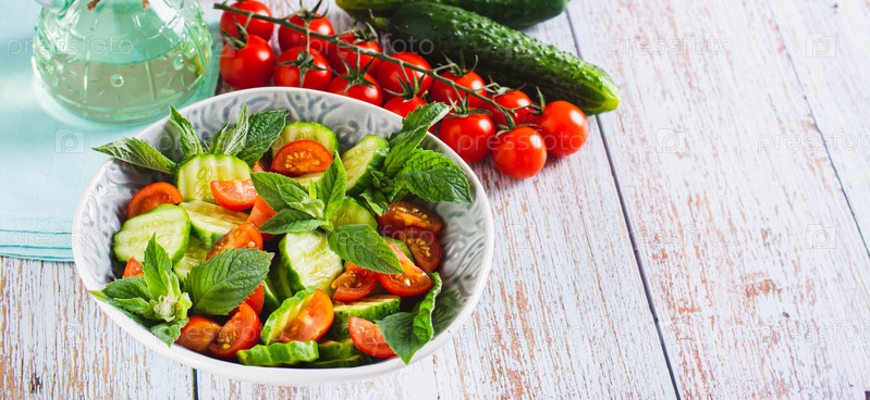 Диетический салат из огурцов, помидоров и мяты в миске и овощей на веб-баннере стола