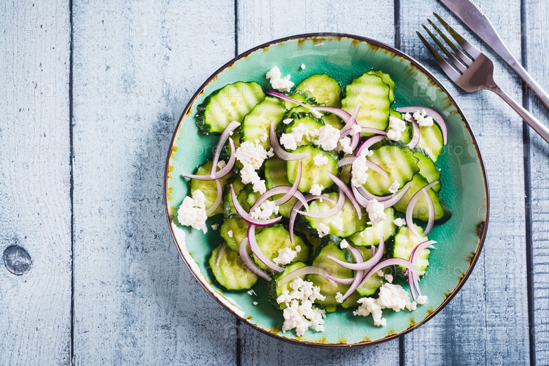 Крупный план салата из свежего огурца, рикотты и красного лука на тарелке на столешнице