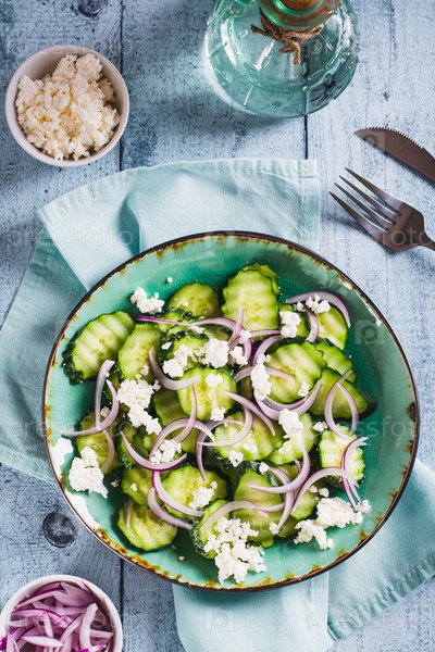 Диетический салат из огурцов, красного лука и рикотты на тарелке на столешнице и вертикальный вид