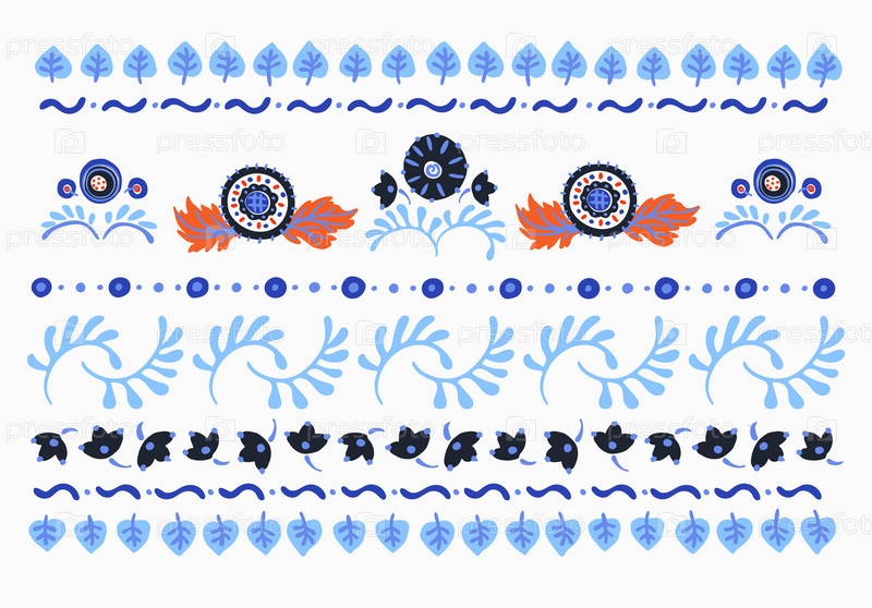 Набор этнических элементов. Бордюр представляет собой полосу с цветами, листьями, ветками, вензелями. Народная вышивка. Славянский, украинский, русский мотив. Хохлома, матрешка, дымковская игрушка. Мексиканский, индийский, цыганский ковер. Вязаное кружево